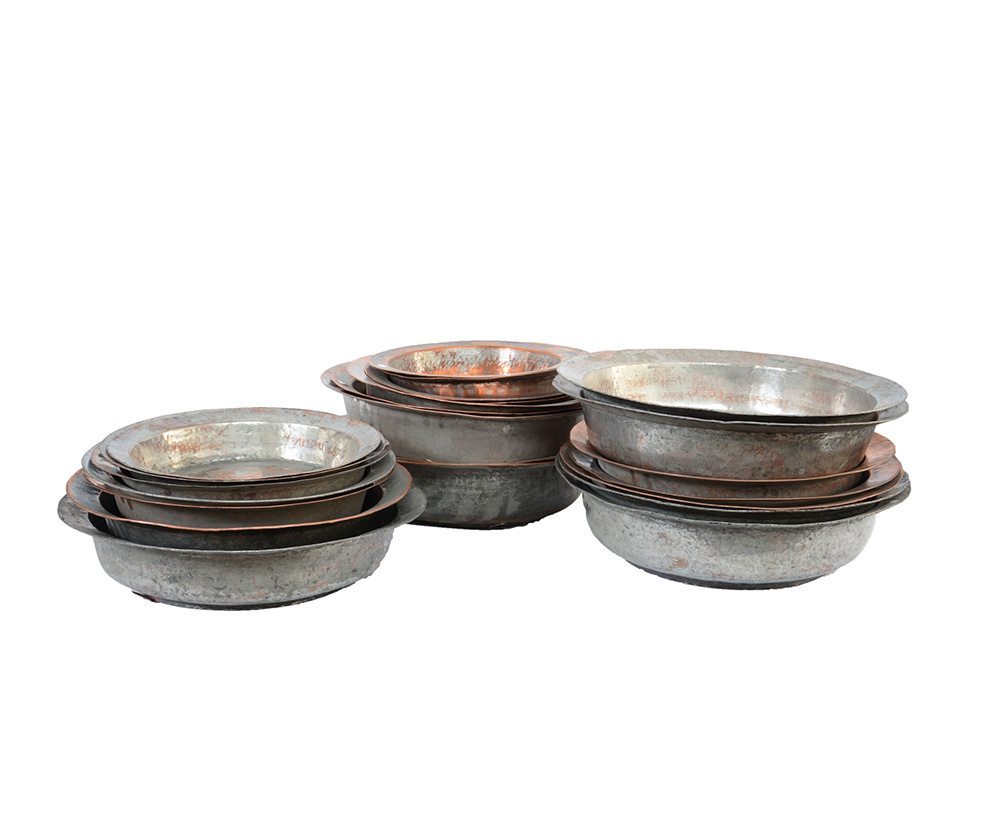 Lotto composto da ventiquattro bacili orientali in metallo e rame, decori e misure diversi (difetti)