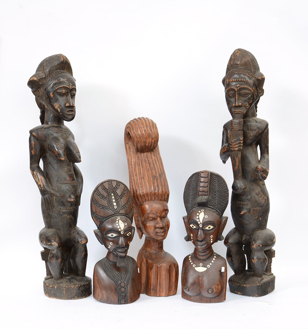 Arte africana, lotto composto da cinque sculture lignee (misure diverse) (difetti)