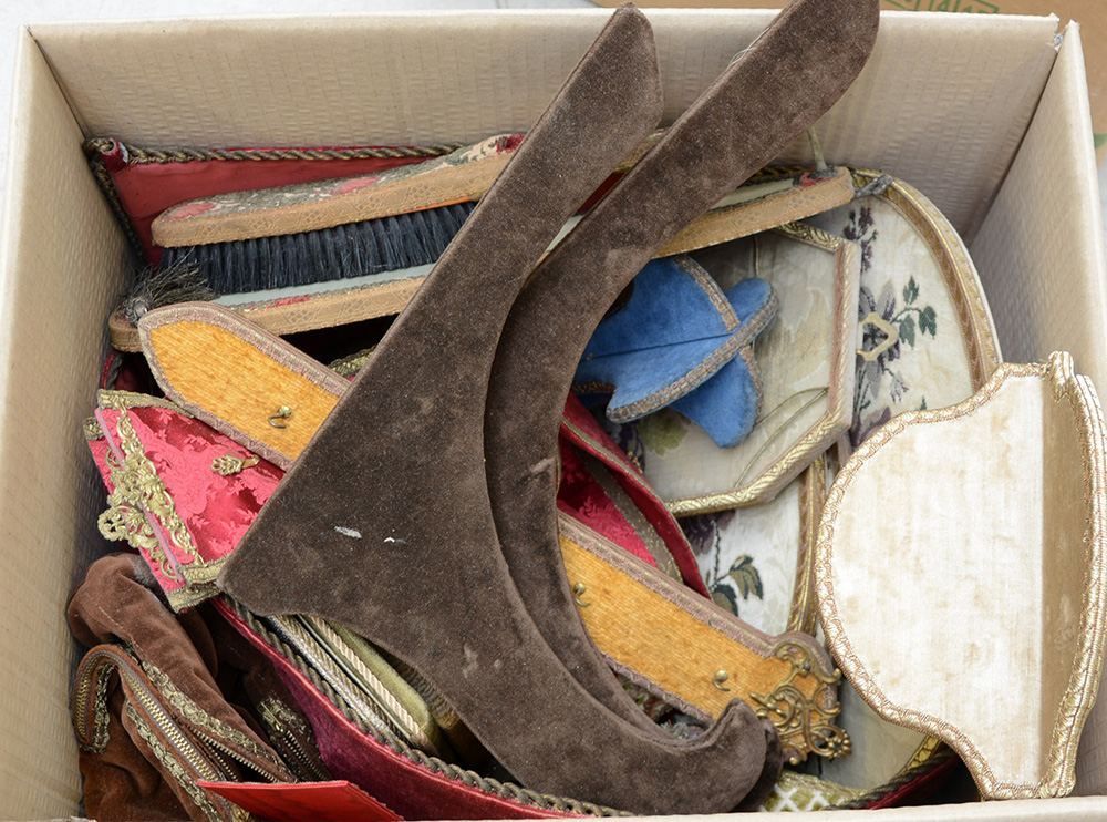 Cartone contenente numerosi oggetti decorativi realizzati con tessuti e passamanerie (difetti)
