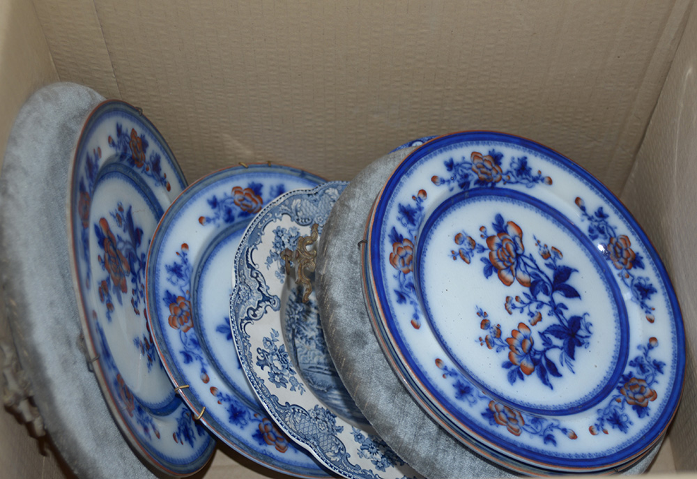 Manifattura inglese, cartone contenente nove piatti con differenti decori...