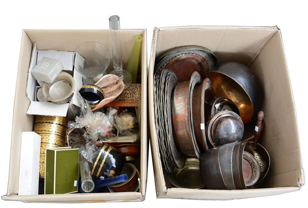 Lotto contenuto in due scatole contenenti numerosi oggetti in metallo, vetro e lacca di manifattura moderna, alcuni di gusto orientale (difetti)
