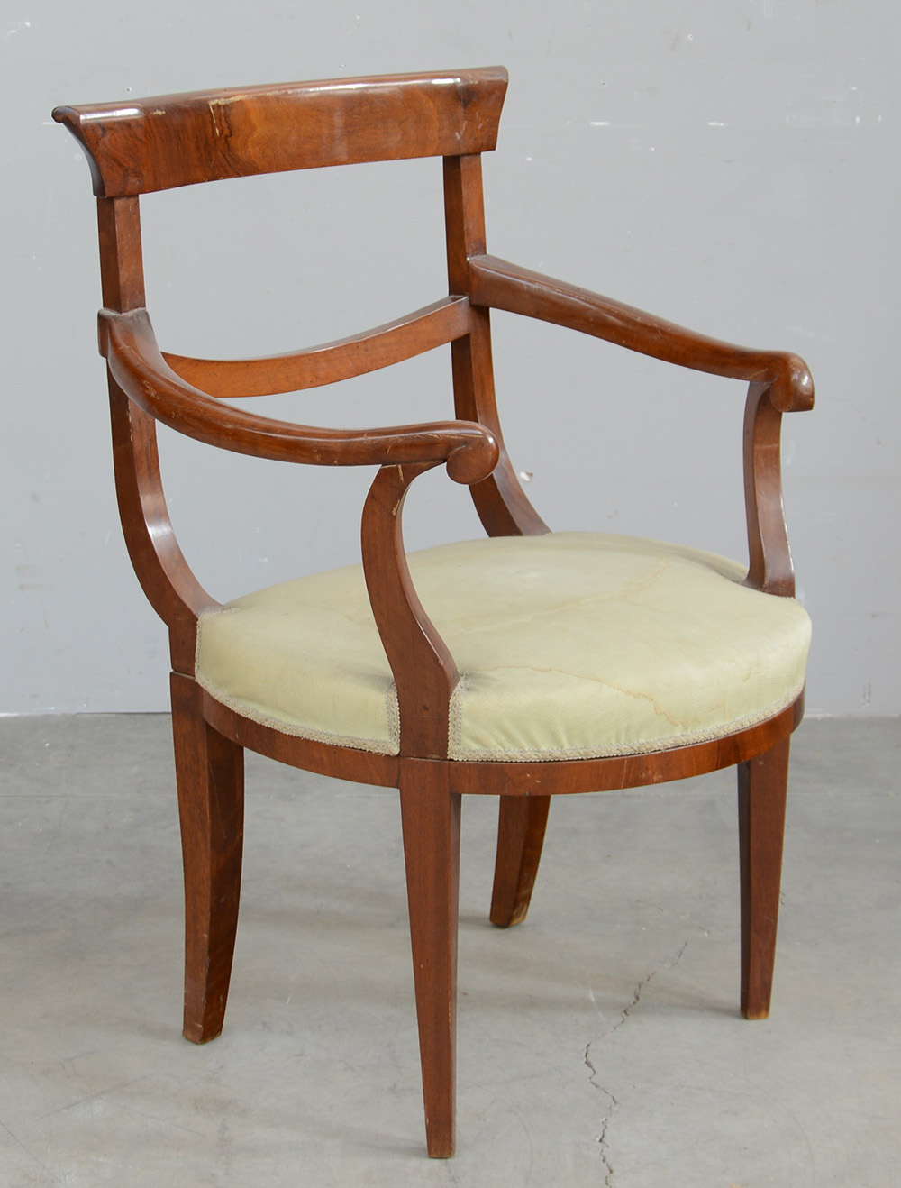 Poltroncina in mogano con braccioli curvi, schienale a giorno, gambe rastremate (difetti)