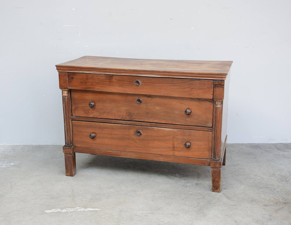 Comò lastronato a tre cassetti sul fronte, decorato da mezze colonne sui lati e piedi a pilastro. Sec. XIX (cm 123x86x57) (difetti)