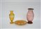 Manifattura di Boemia, fine sec. XIX. Lotto composto da due vasi e un piatto in cristallo molato di color giallo e vinaccia, ghiere in metallo argentato (difetti)