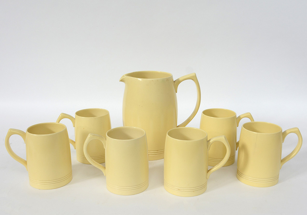 Manifattura di Wedgwood, designer Keith Murray, brocca con cinque tazze in ceramica smaltata color crema (difetti)