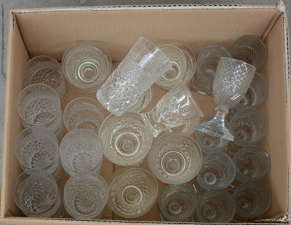 Cartone contenente numerosi bicchieri in cristallo sfaccettato, manifatture...