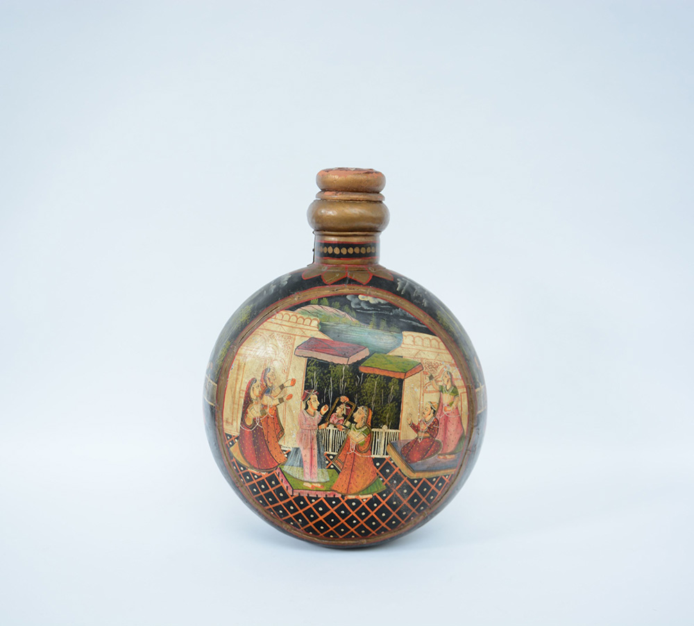 Fiasca in metallo smaltato con coperchio in legno, decorata con secne di corte (difetti) manifattura indiana, sec. XX (h.52 cm.)