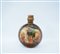 Fiasca in metallo smaltato con coperchio in legno, decorata con secne di...