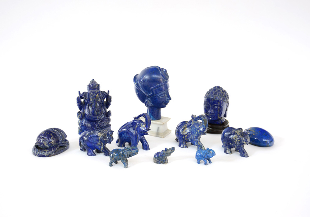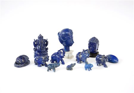 Arte orientale, lotto composto da due fermacarte, due volti e otto sculture raffiguranti elefanti in lapislazzuli di diversa misura (difetti)