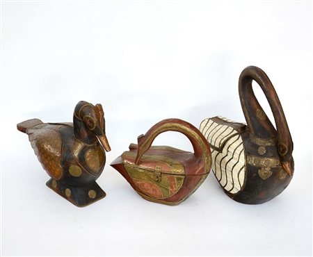 Lotto composto da una scultura a forma di anatra e due scatole forma di cigno in legno e metallo (difetti)