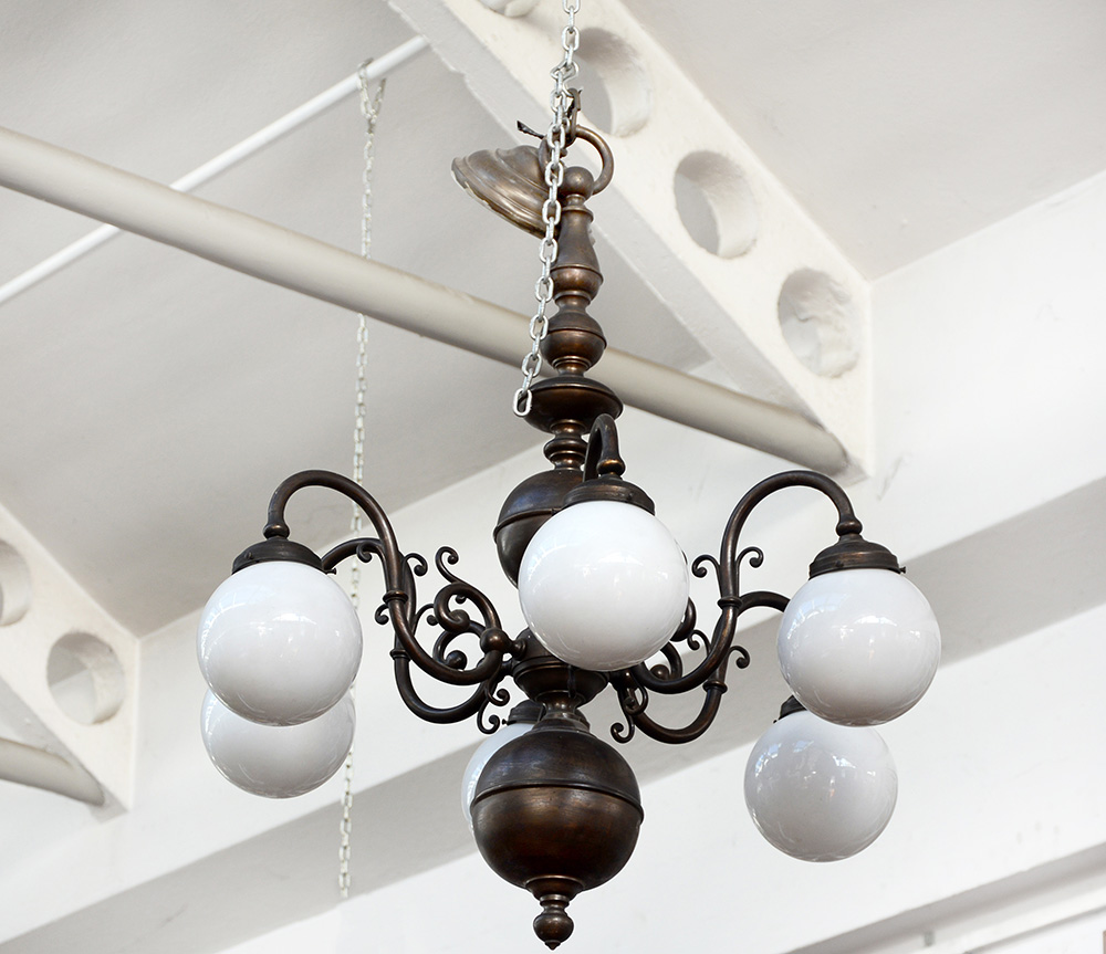 Lampadario in stile olandese a sei braccia sagomate, paralumi in vetro (h cm 96)(difetti)