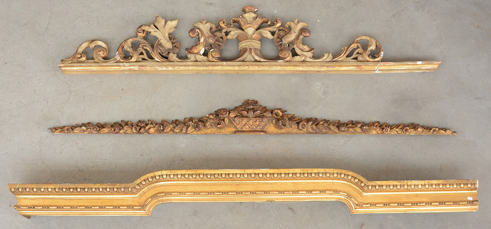 Lotto composto da una riloga e due fregi in legno dorato intagliato (difetti e mancanze)