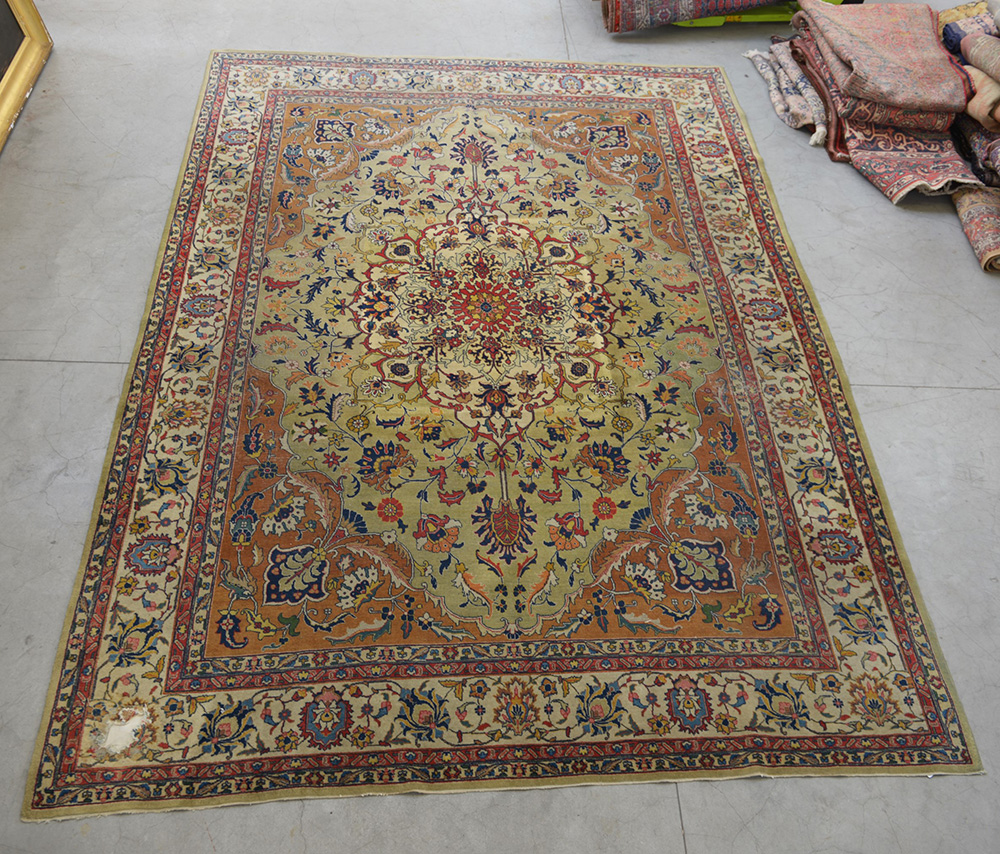 [Tappeti] Tappeto Joshagan, Persia, sec. XX. Disegno a medaglione policromo su fondo verde chiaro, con angoli color tabacco (cm 375x275)(difetti)