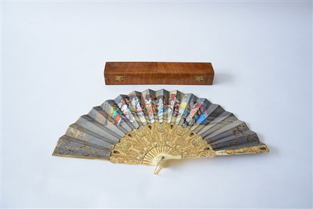 Ventaglio con stecche traforate e pagina dipinta raffigurante la festa andalusa "Baile del candil", mentre sul verso è raffigurato un paesaggio; titolata e firmata sulla pagina anteriore, custodia in legno. Spagna, sec. XX (difetti)