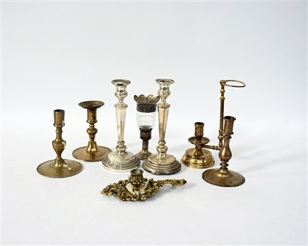 Lotto di otto candelieri di dimensioni e materiali differenti (difetti) (h max 22)