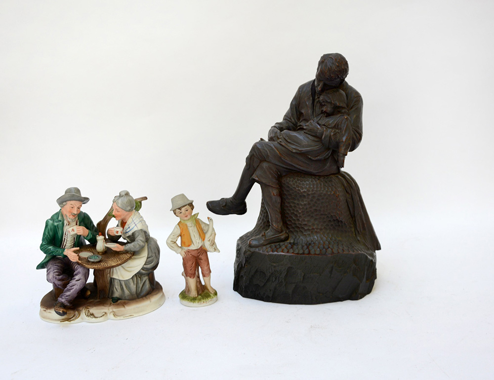 Lotto composto da una scultura in legno intagliato raffigurante una bambina in braccio al padre, firmata all'interno (h cm 34), e due sculture in porcellana con figure del mondo rurale (h max cm 18) (difetti)