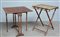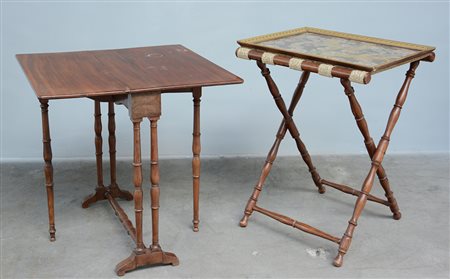 Lotto composto da un tavolino ad alette con montanti torniti ed un tresporlo con vassoio decorato da applicazioni in tessuto operato (difetti)