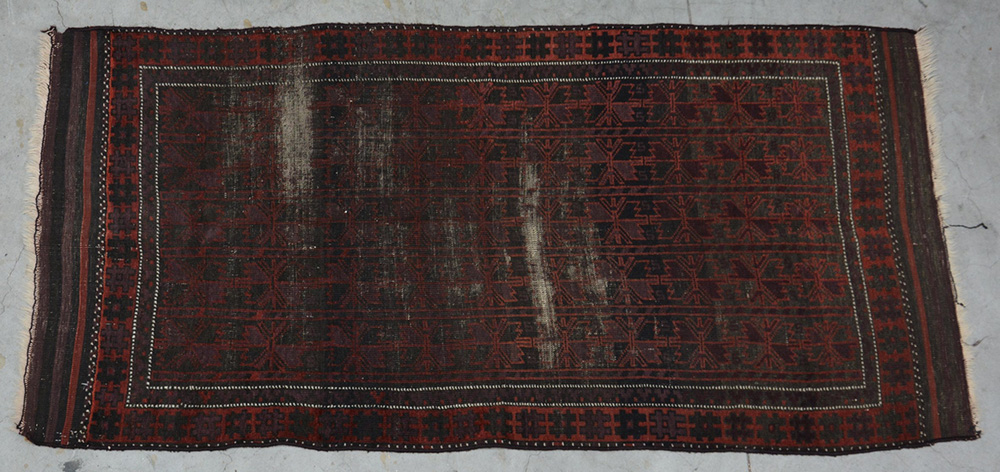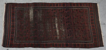 [Tappeti] Tappeto Beluchistan, Persia, fine sec. XIX. Disegno geometrico nei toni del boreadux e rosso su fondo marrone (cm 180x88) (gravi difetti)