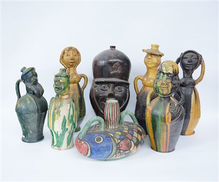 Lotto composto da otto bottiglie e fiasche animate in ceramica e terracotta policroma (difetti)
