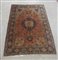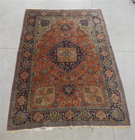 [Tappeti] Tappeto Keshan, Persia, sec. XX. Disegno a medaglione blu su campo arancio millefleur. Bordure Herati (cm 282x190) (difetti e mancanze)
