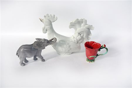 Lotto composto da un gallo in porcellana marcato Richard Ginori (h cm 27), un elefante ed una tazza a forma di fiore (difetti e restauri)