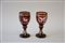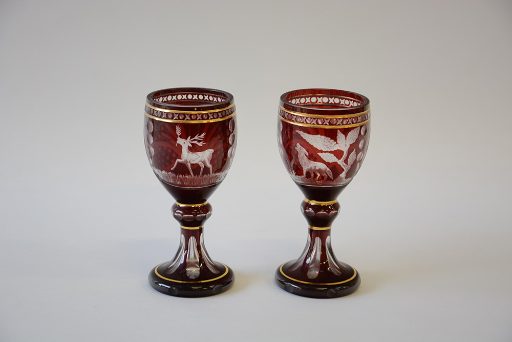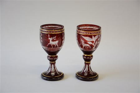 Coppia di calici in cristallo a fondo rosso decorate ad animali e volute