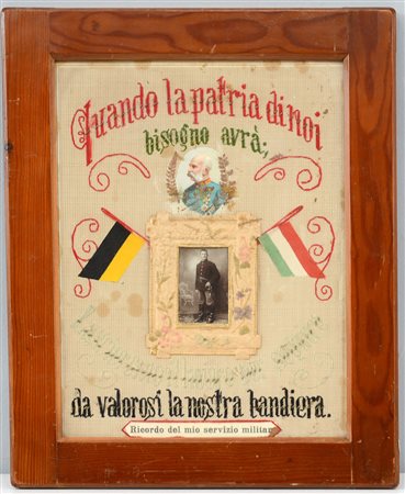 Ricamo commemorativo iscritto e titolato in basso, in cornice