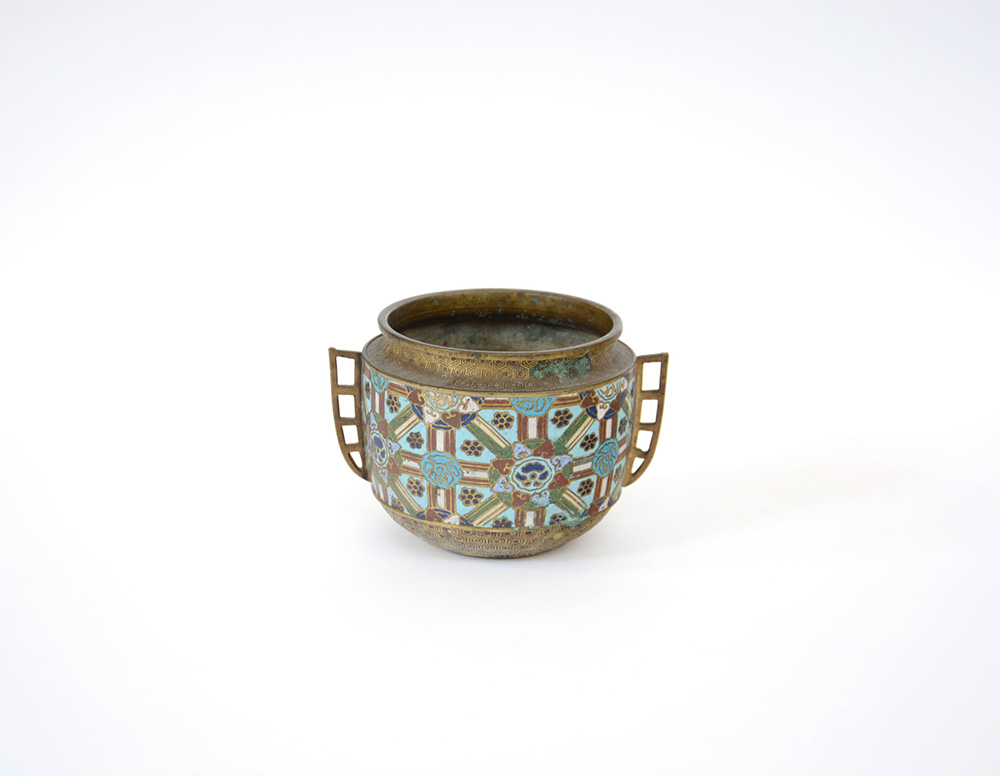 Ciotola biansata in bronzo e metallo cloisonné (difetti) Cina, sec. XX (h. 12 cm.)