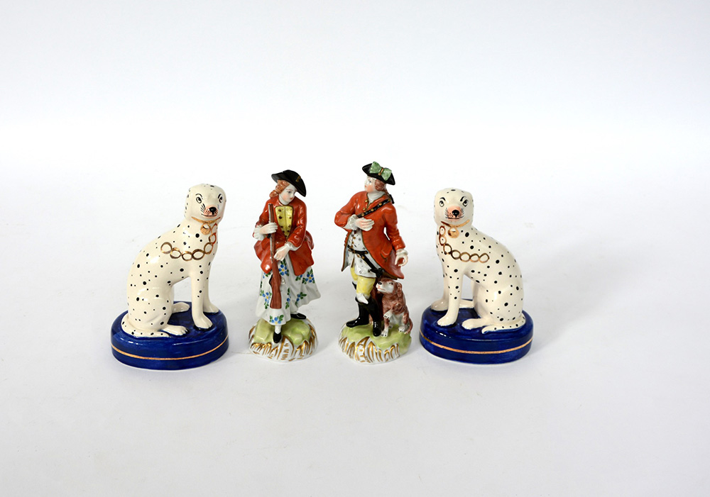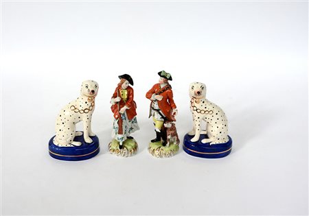 Lotto composto da una coppia di sculture in porcellana decorata in policromia raffiguranti una gentildonna ed un gentiluomo a caccia (h cm 15), ed una coppia di cani su base blu (h cm 13), sec. XX (difetti e mancanze)