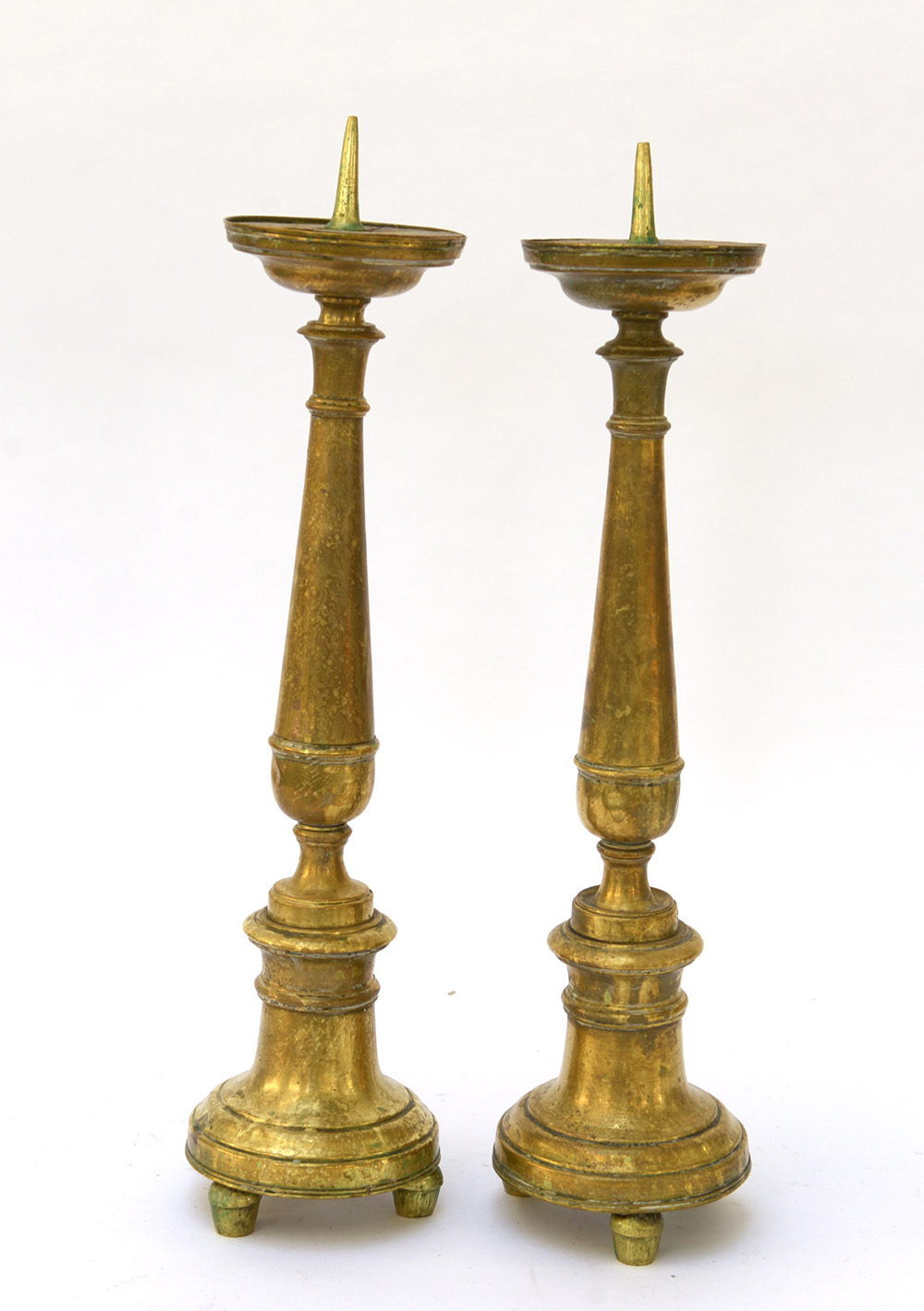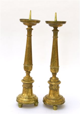 Coppia candelieri ad una fiamma in ottone fine sec. XIX (difetti)