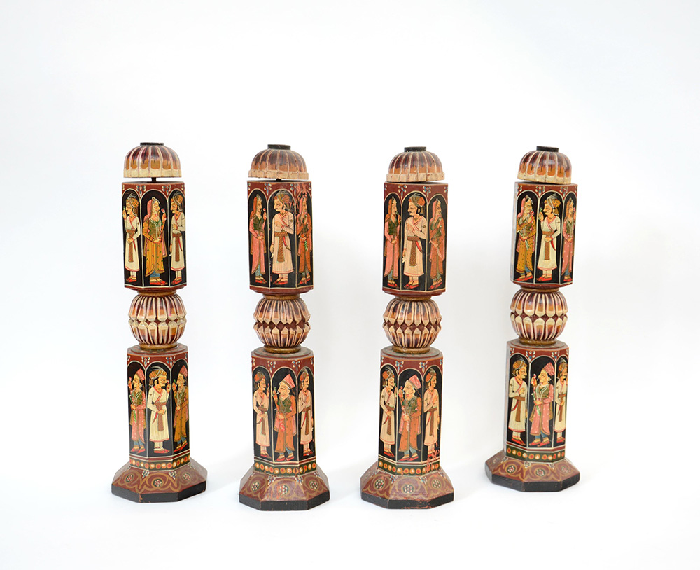 Gruppo di quattro totem indiani in legno dipinto in policromia (difetti) (h.53 cm.)
