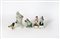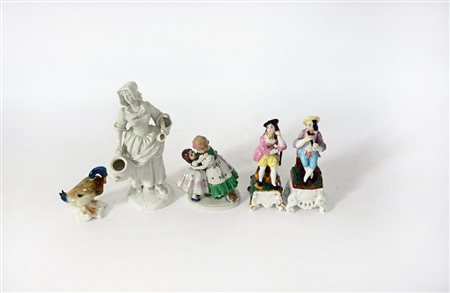 Manifatture diverse. Lotto composto da quattro sculturine raffiguranti figure ed una raffigurante oca in porcellana di manifatture e decori diversi (difetti)