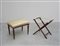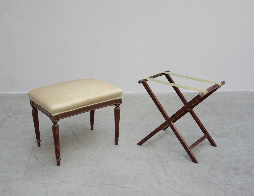 Panchetto rettangolare con struttura in legno, gambe rastremate e seduta rivestita con tessuto beige, a ci si unisce un trespolo porta vassoio (difetti)