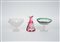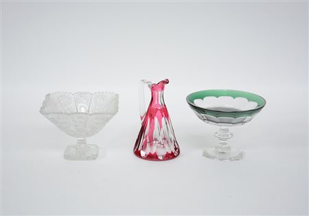 Manifattura di Boemia, fine sec. XIX-inizio sec. XX. Lotto composto da due alzatine e una brocca in cristallo molato trasparente verde e rosso (difetti)