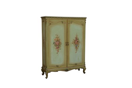 Piccolo armadio a due ante in legno laccato a fondo verde, dipinto in policromia a motivi floreali. Piedi, fascia e montanti intagliati (cm 114x152x39) (difetti)