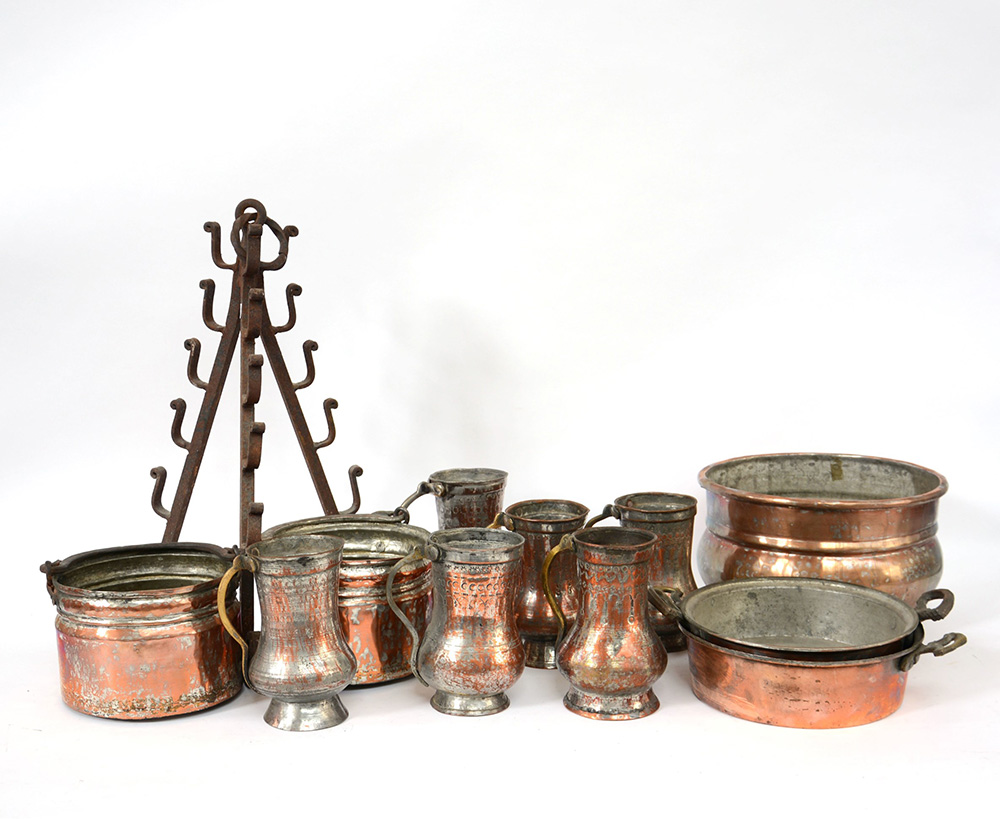 Lotto composto da un trespolo in ferro battuto, cinque boccali e cinque paioli di diversa battuta in metallo e rame (difetti)