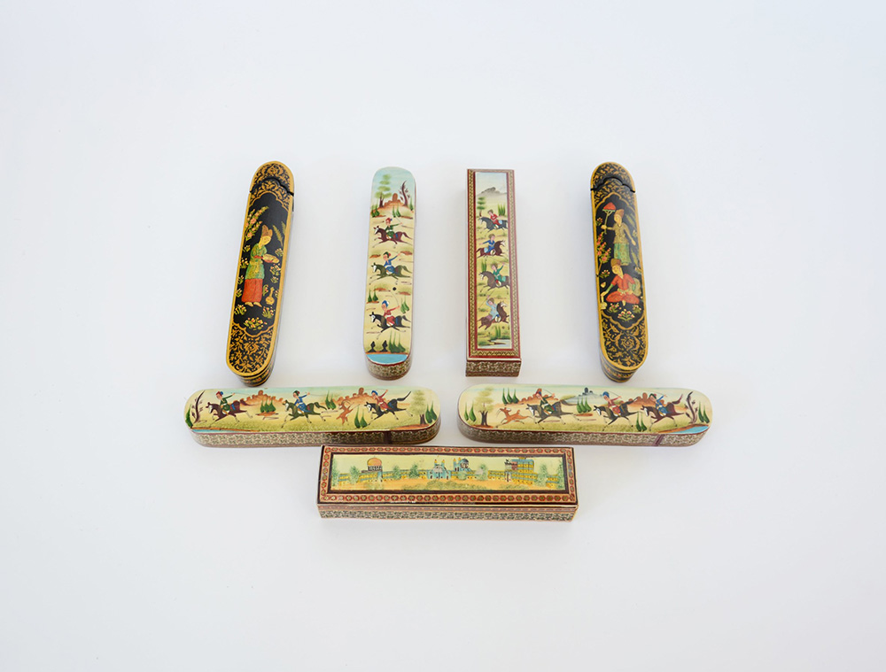 Gruppo di sette portapenne manifattura indiana in legno laccato ed intarsiato (difetti)