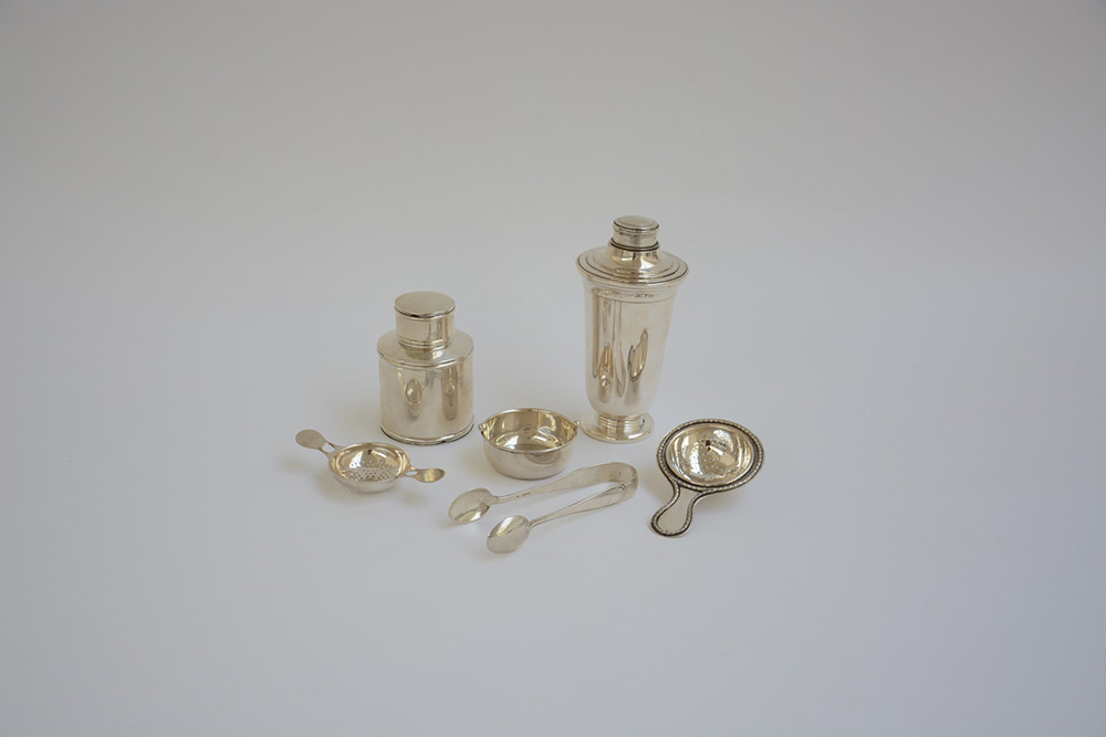 Lotto di argenti composto da un tea caddy con marchio di Londra, un piccolo shaker marcato Miracoli, due colini pet tè, una ciotolina ed una molla per zollette (gr. 490 ca) (difetti)