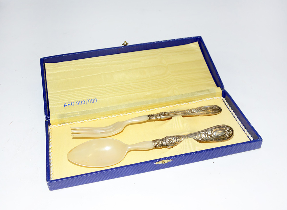 Coppia di posate da insalata con manico in argento. Italia XX secolo. In custodia (difetti)