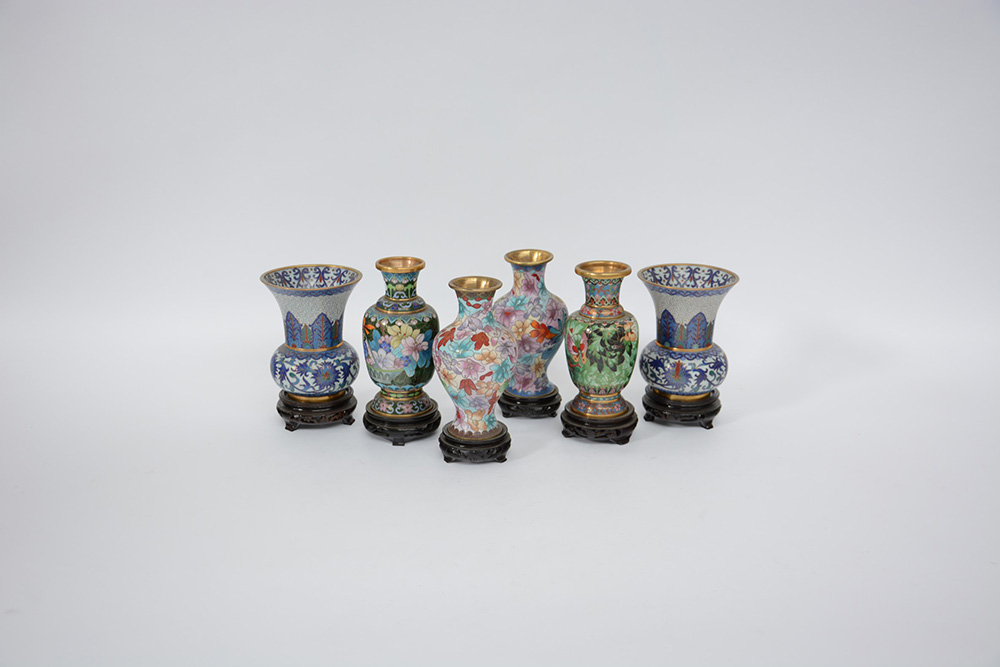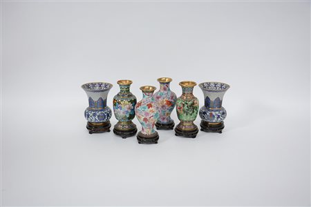Lotto composto da tre coppie di vasetti in metallo cloisonné, con basi in legno (difetti) Cina, sec. XX