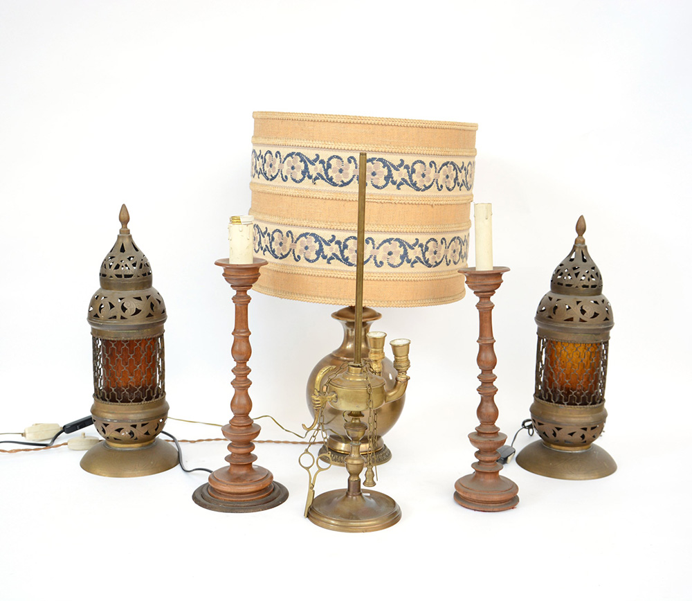 Lotto composto da quattro lampade da tavolo e due lampade ad olio in bronzo, metallo e legno (misure diverse) (difetti)