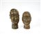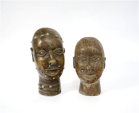 Lotto composto da due teste africane in bronzo decorate con applicazioni di pietra dura (misure diverse) (difetti)