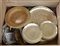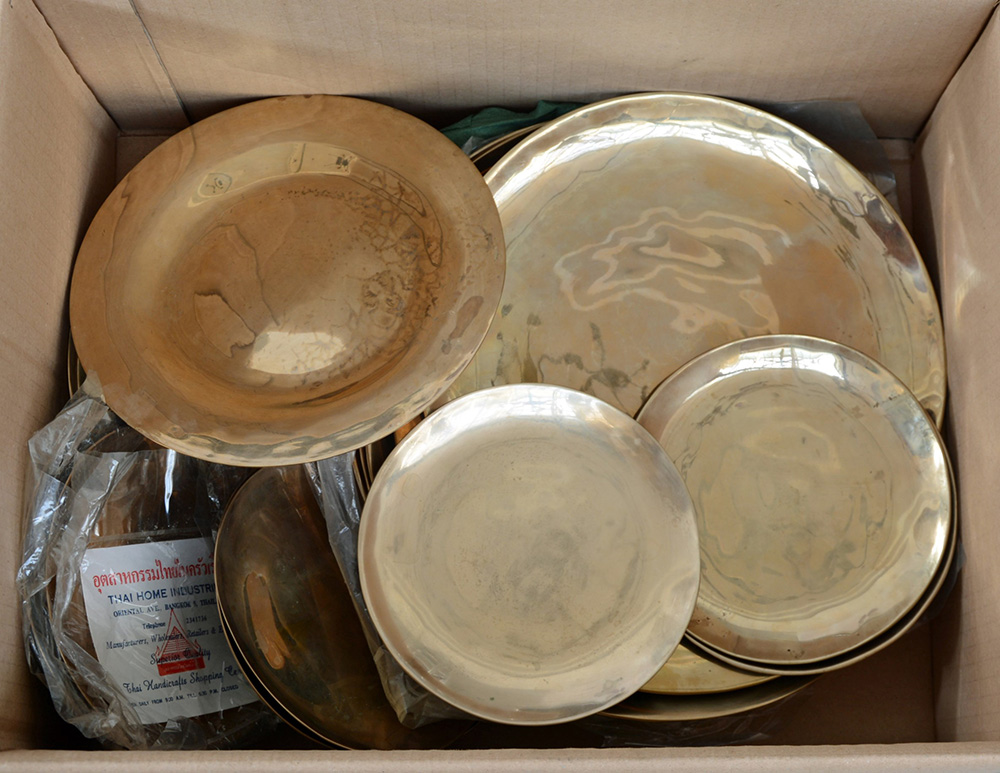 Cartone contenente numerosi sottopiatti e sottobicchieri in metallo liscio