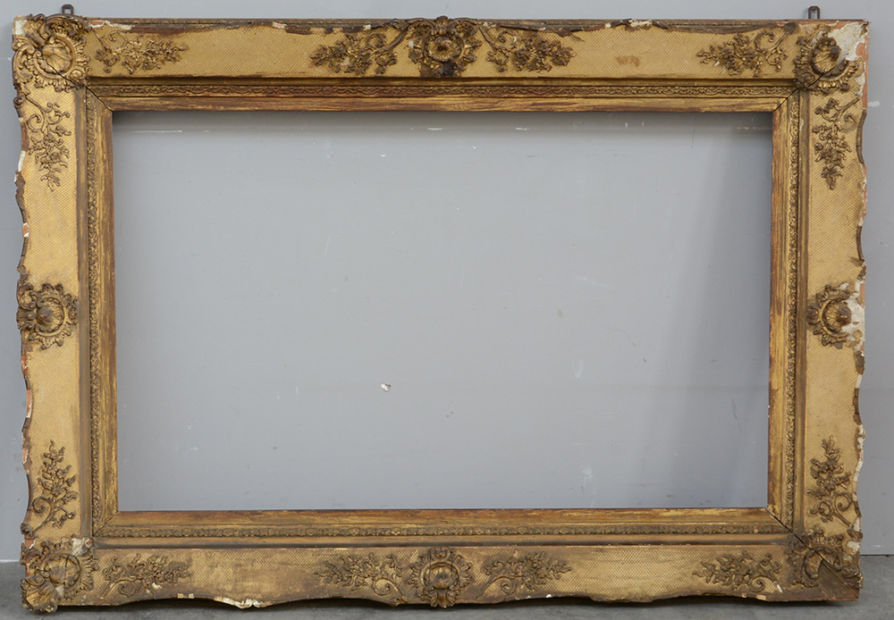 Grande cornice rettangolare in lengo e pastiglia dorata, decorata a motivi vegetali, fiori e volute. Fine sec. XIX (luce cm 112x69) (difetti e mancanze)