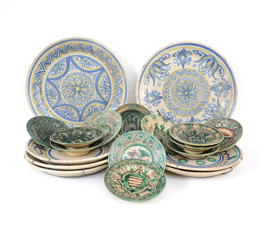 Lotto composto da sette grandi piatti e dodici piccoli in terracotta decorata in policromia (difetti)