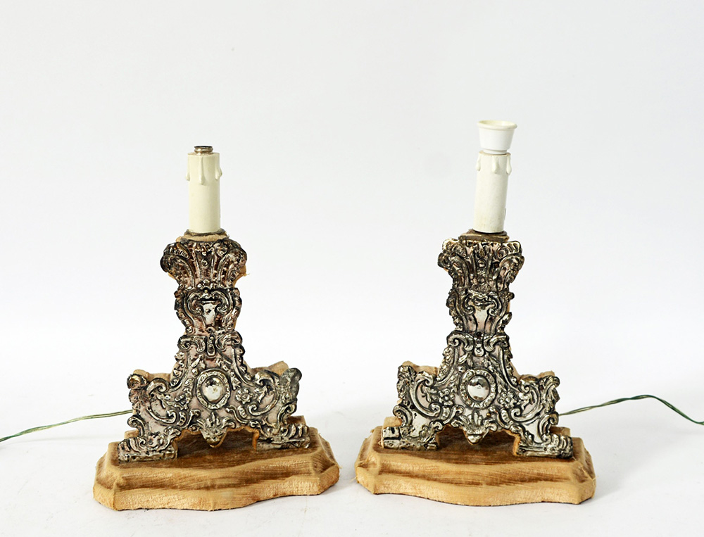 Coppia di basi di reliquiari montati a lampade con struttura in legno...