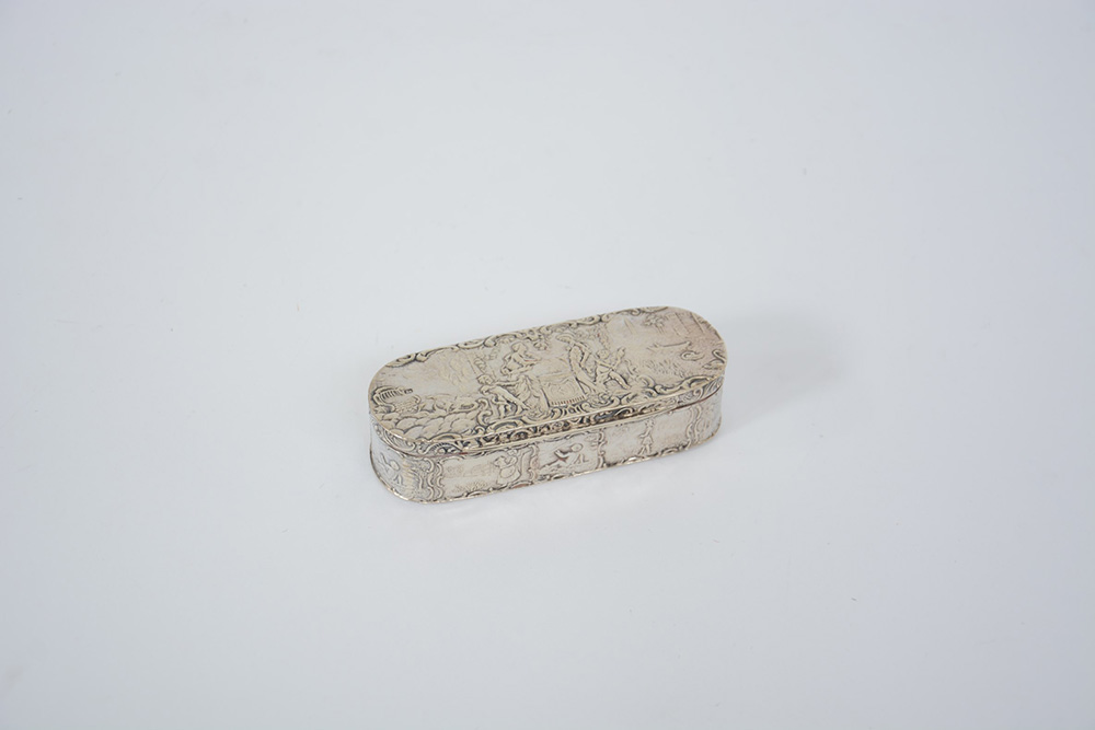 Scatola con coperchio di forma ovale decorata con scene bucoliche. Olanda, fine sec. XIX (cm 11x4,5x2,5) (gr 80 ca.) (difetti)