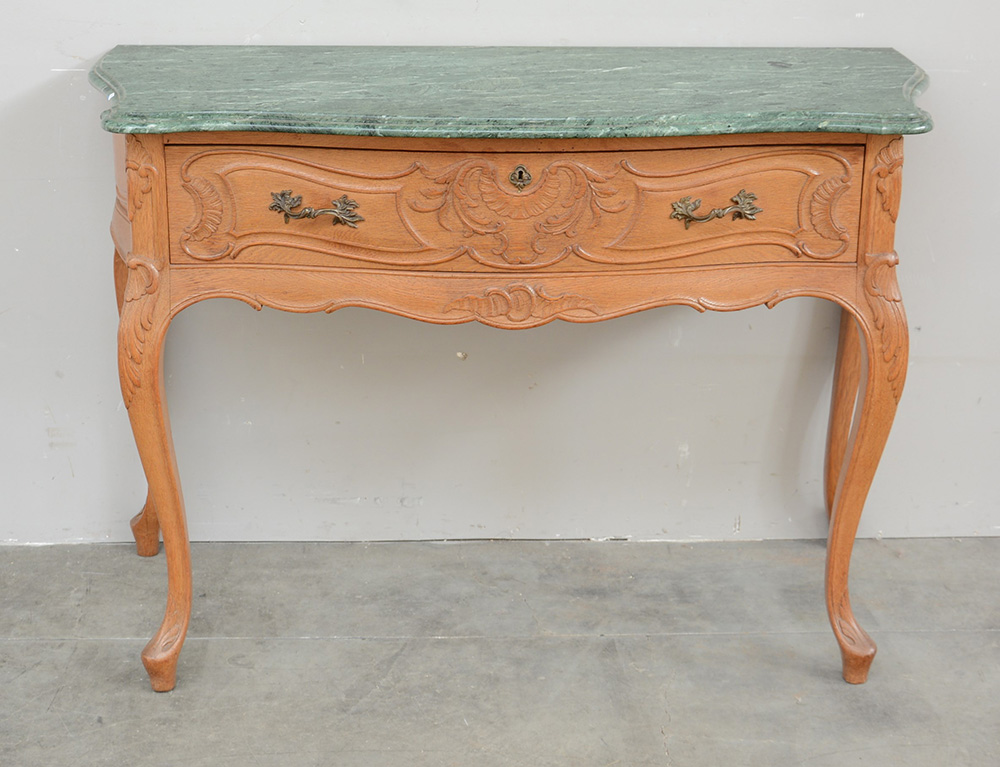 Consolle di forma sagomata in rovere ad un cassetto sottopiano. Gambe e fascia sagomata. Piano in marmo (cm 122x83x54)