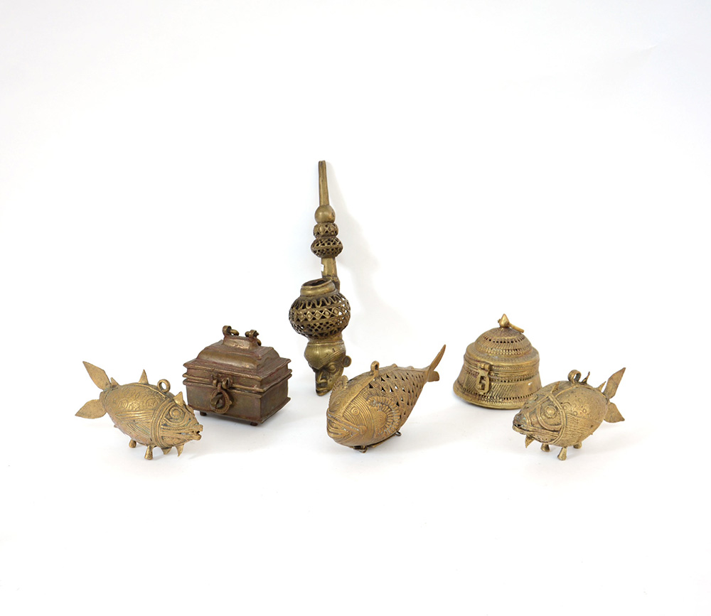 Manifattura africana, lotto composto da una pipa da oppio, due scatole e tre sculture raffiguranti pesci in bronzo (misure diverse)