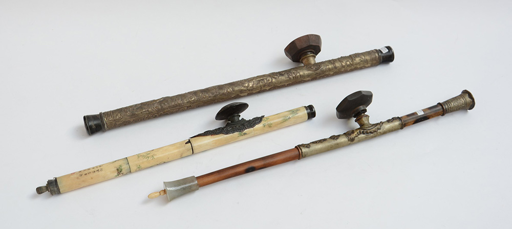 Lotto di tre pipe di misure diverse, di manifattura orientale in metallo, legno ed osso (difetti)